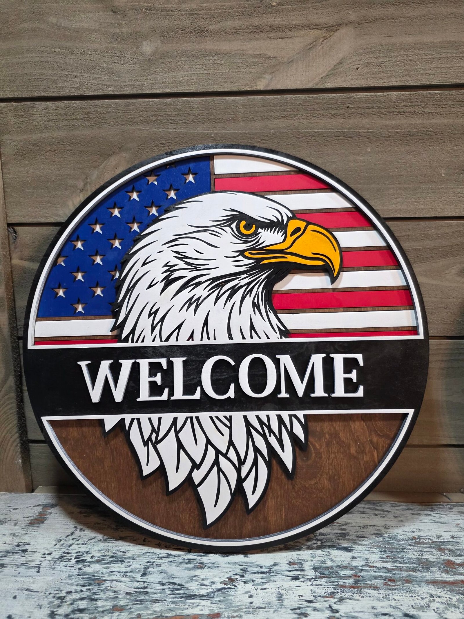 Make a lasting first impression with our beautifully designed Welcome Door Sign featuring a majestic Patriotic Eagle. Perfect for showcasing your love for the country, this sign is an excellent addition to any home or business entryway.